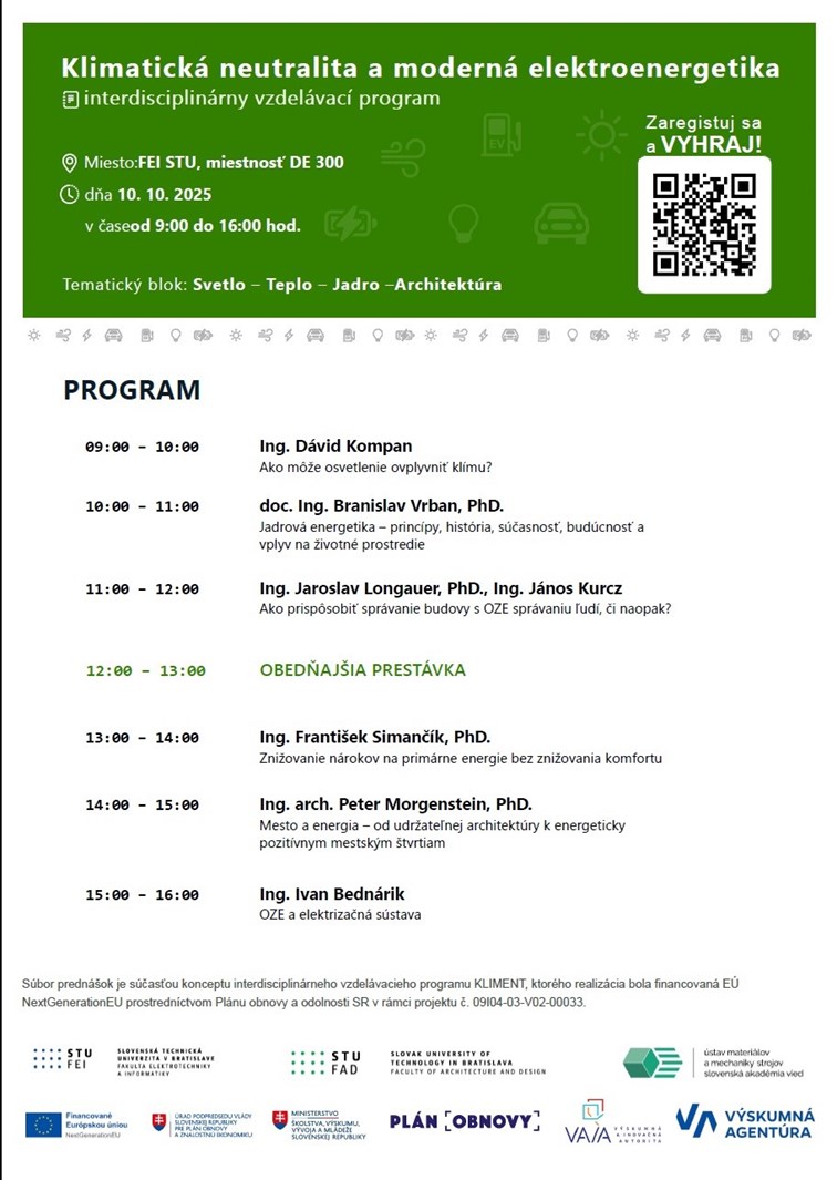 Dňa 10.10.2025 organizujeme na FEI STU v Bratislave v rámci vzdelávacieho programu KLIMENT prednášky pre študentov a odbornú i laickú verejnosť v rámci tematického bloku: Svetlo – Teplo – Jadro –Architektúra.